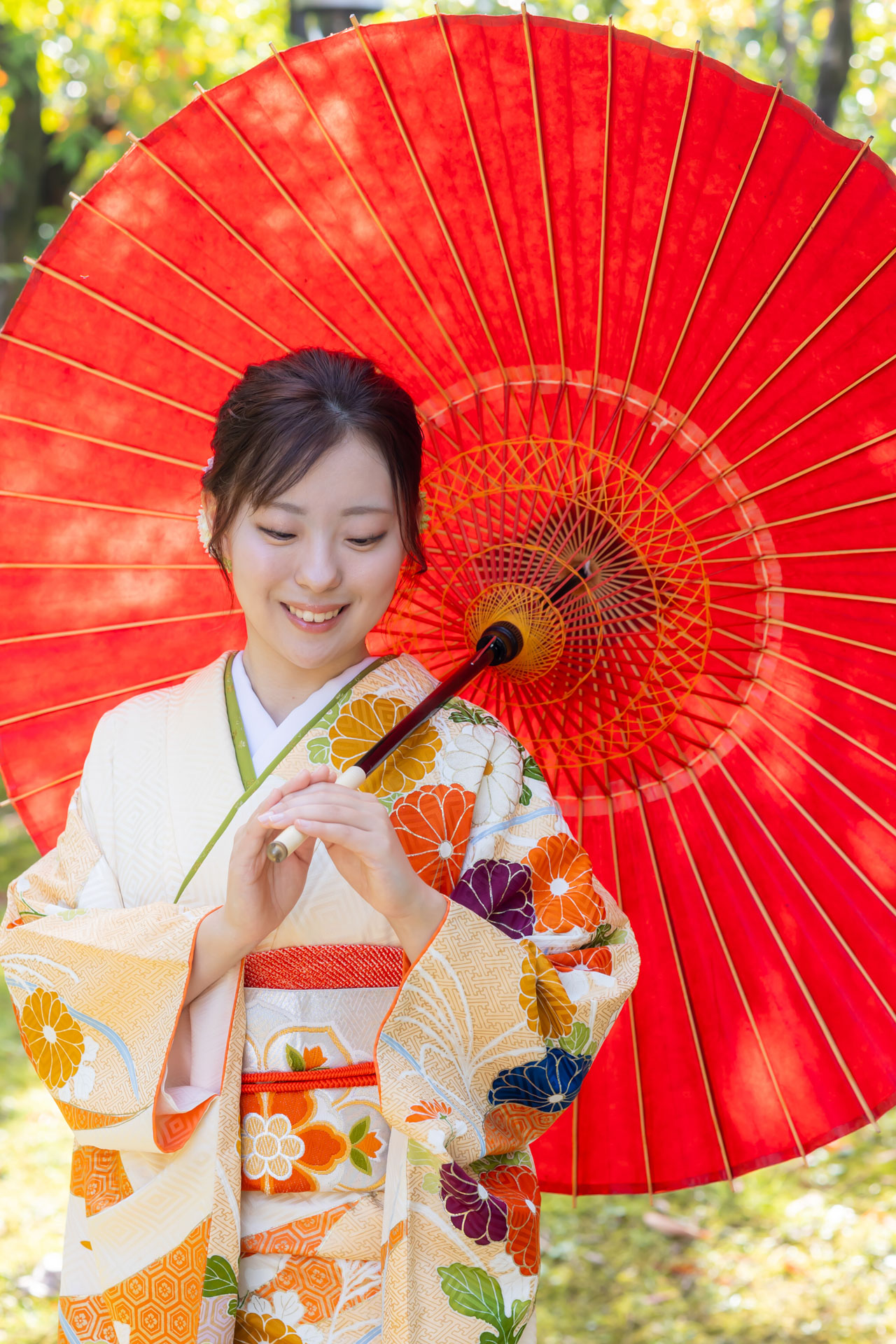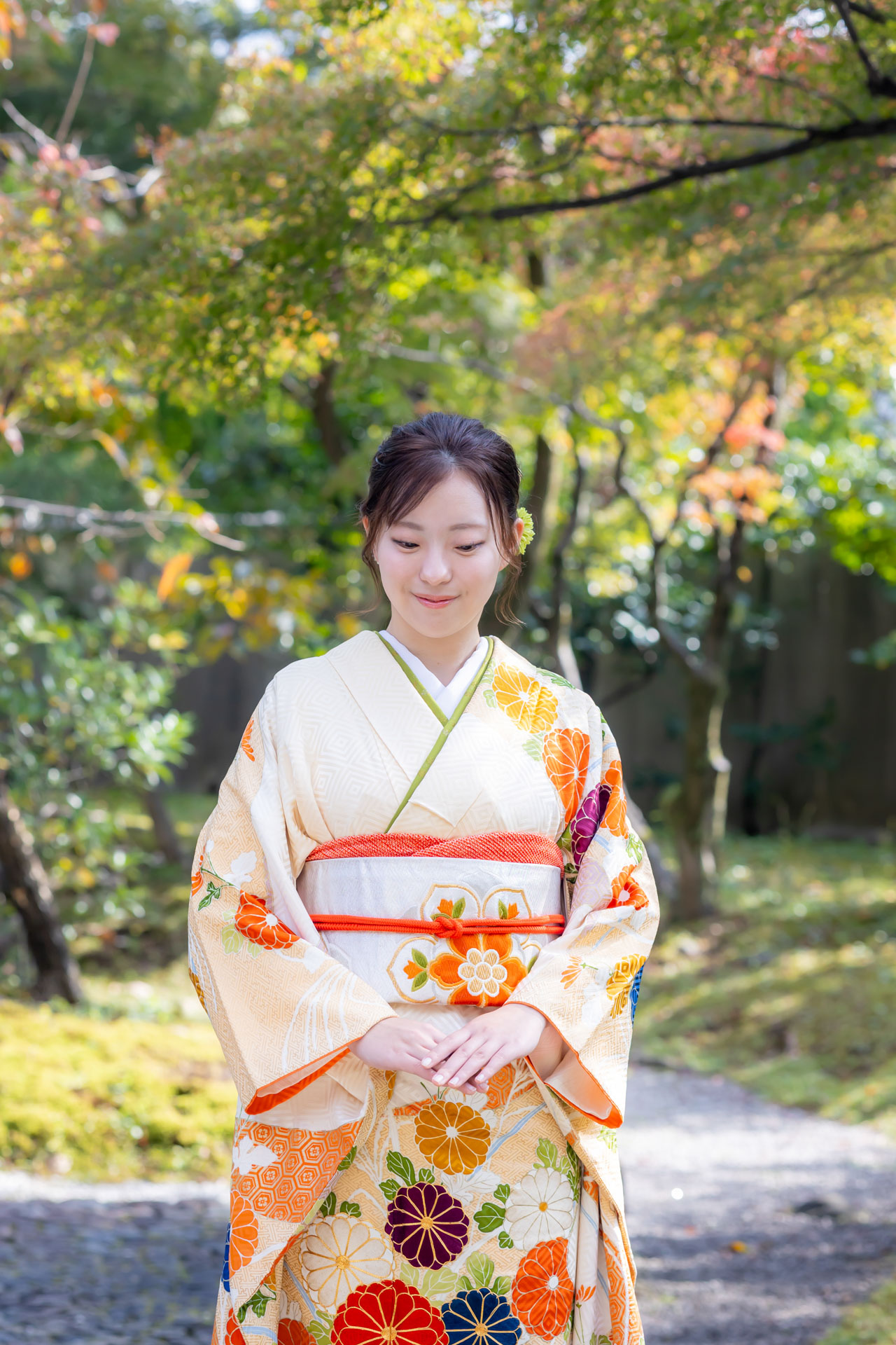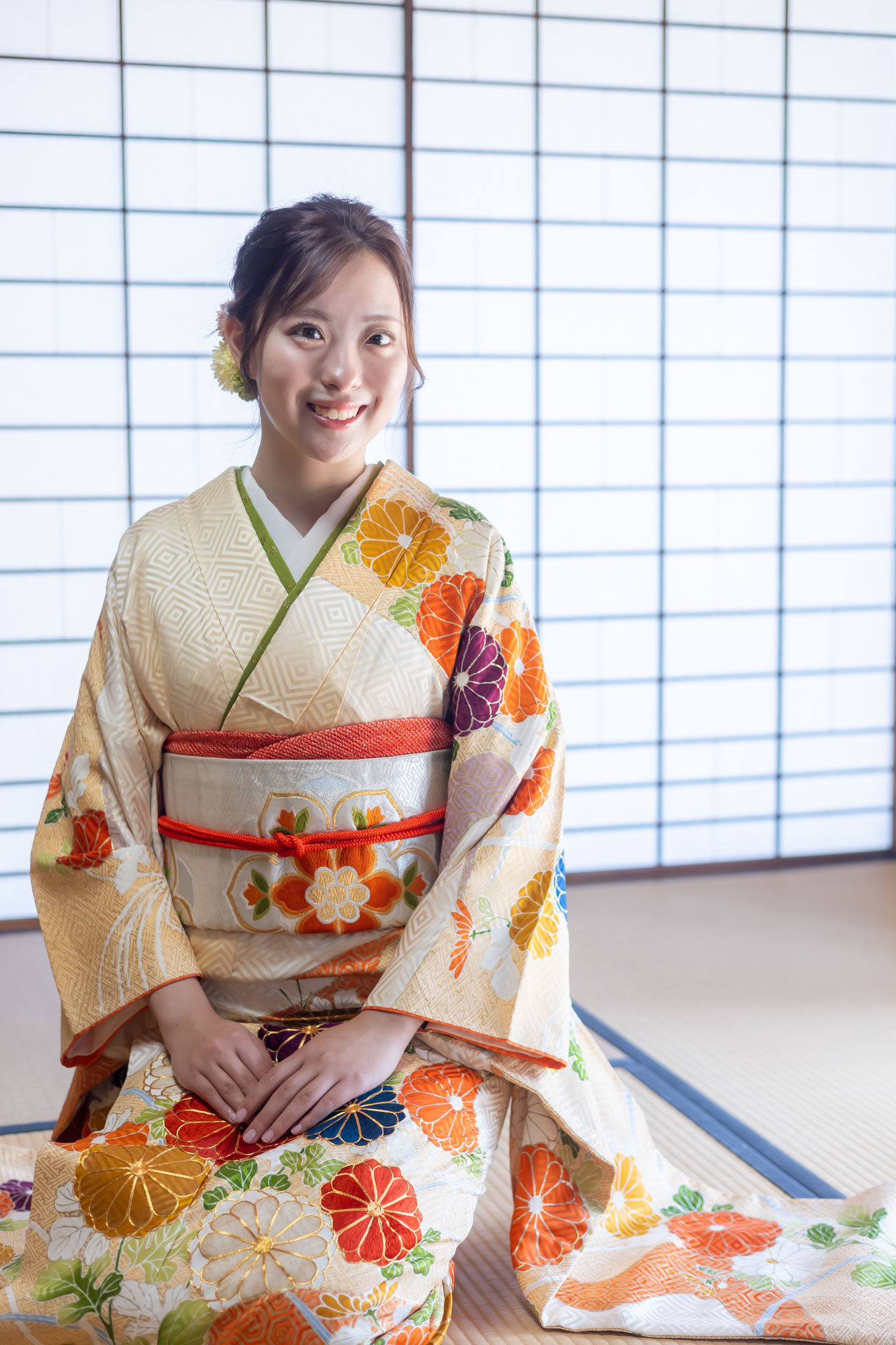 上品な振袖を着てはにかんだ笑顔が素敵なお嬢様と成人式の前撮りです