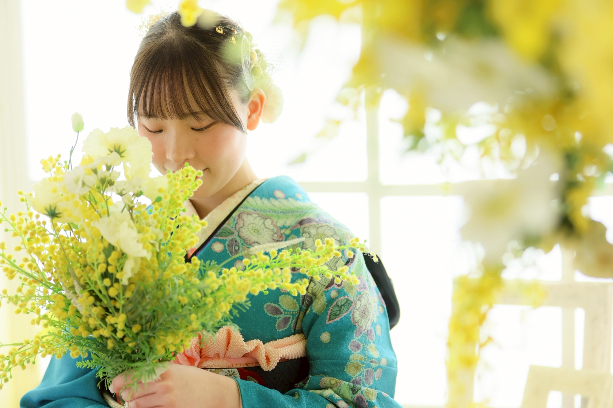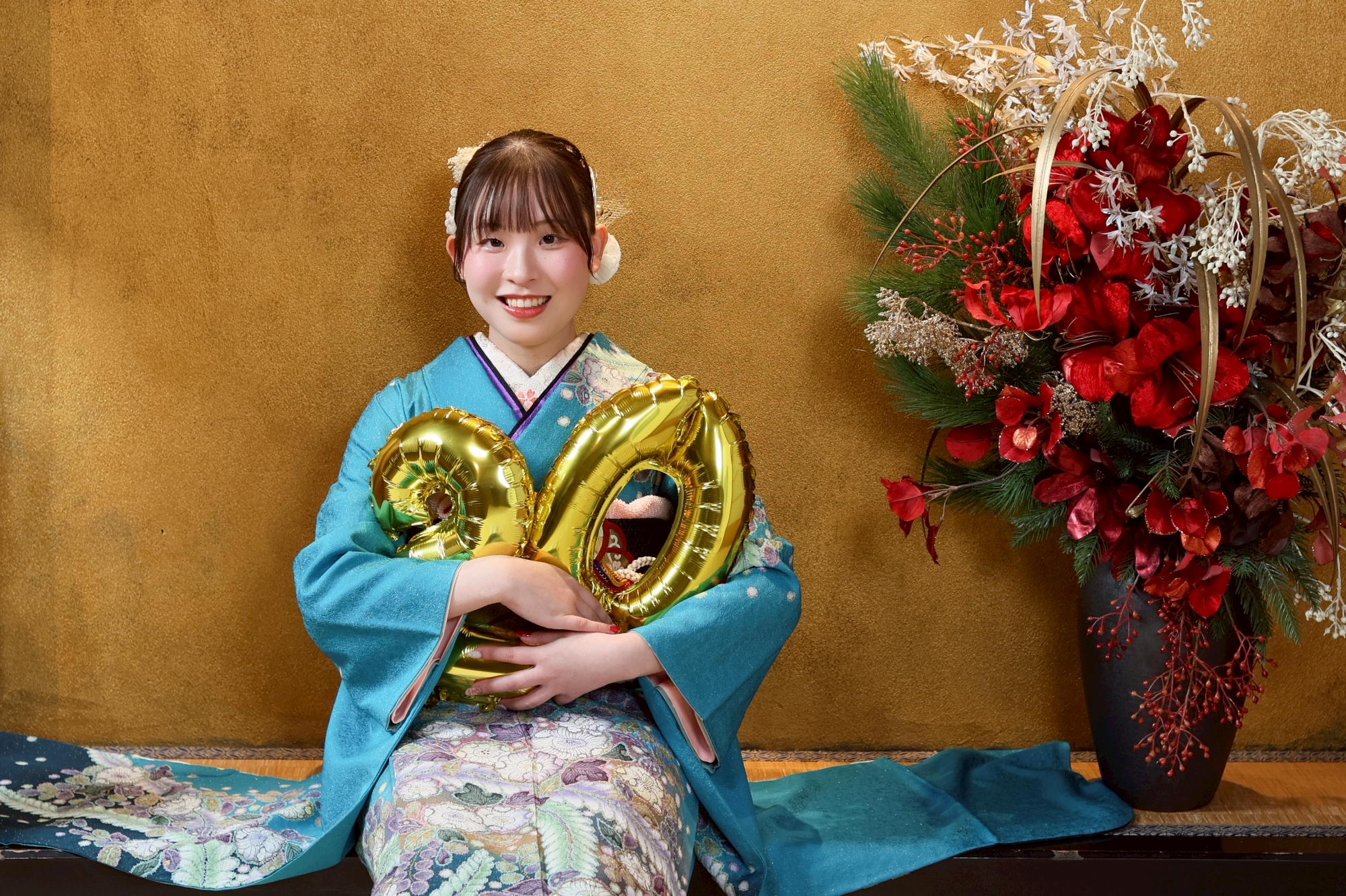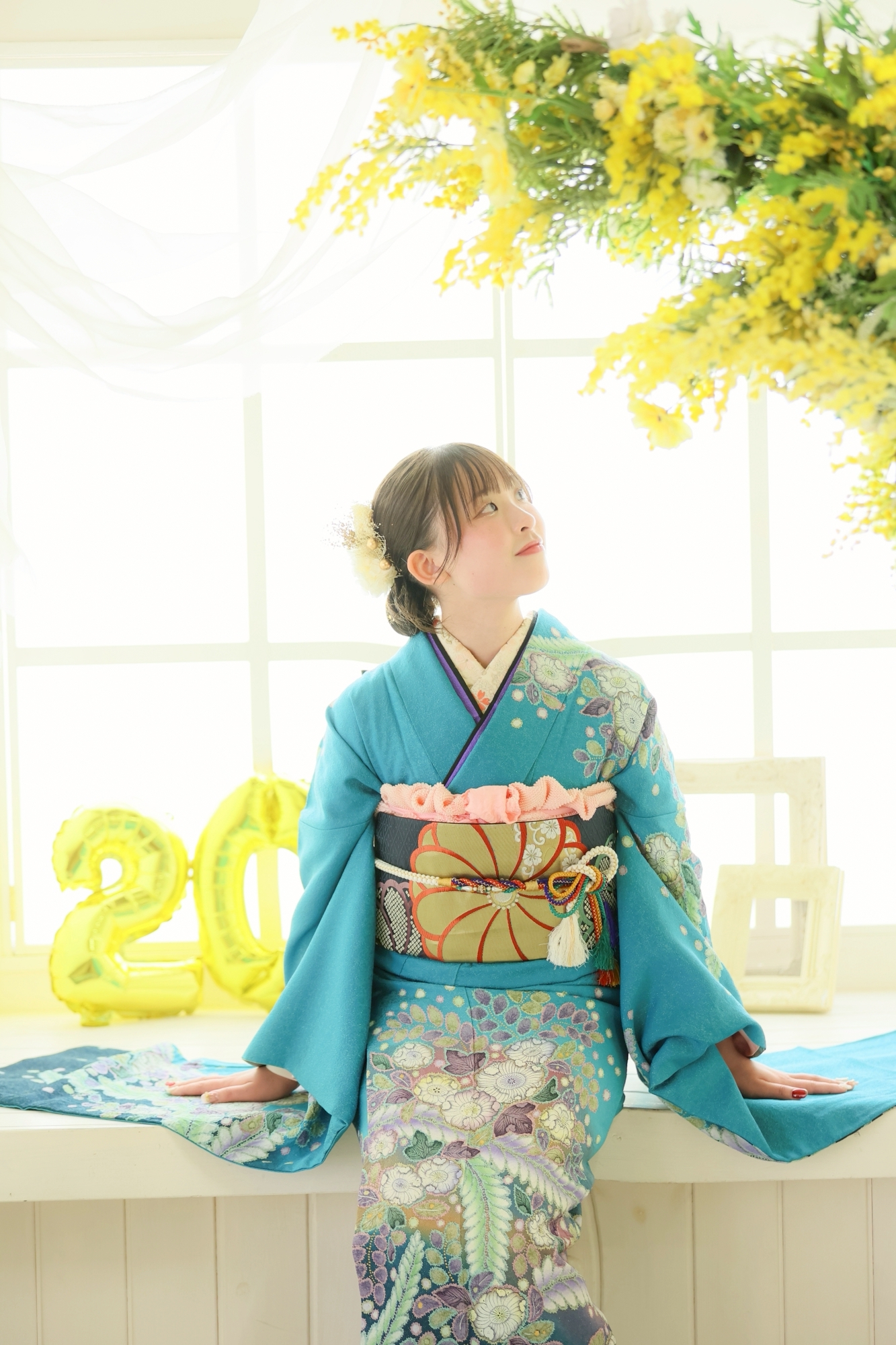 青の着物がとっても可愛いですね♡20歳のバルーンを持っていい笑顔です
