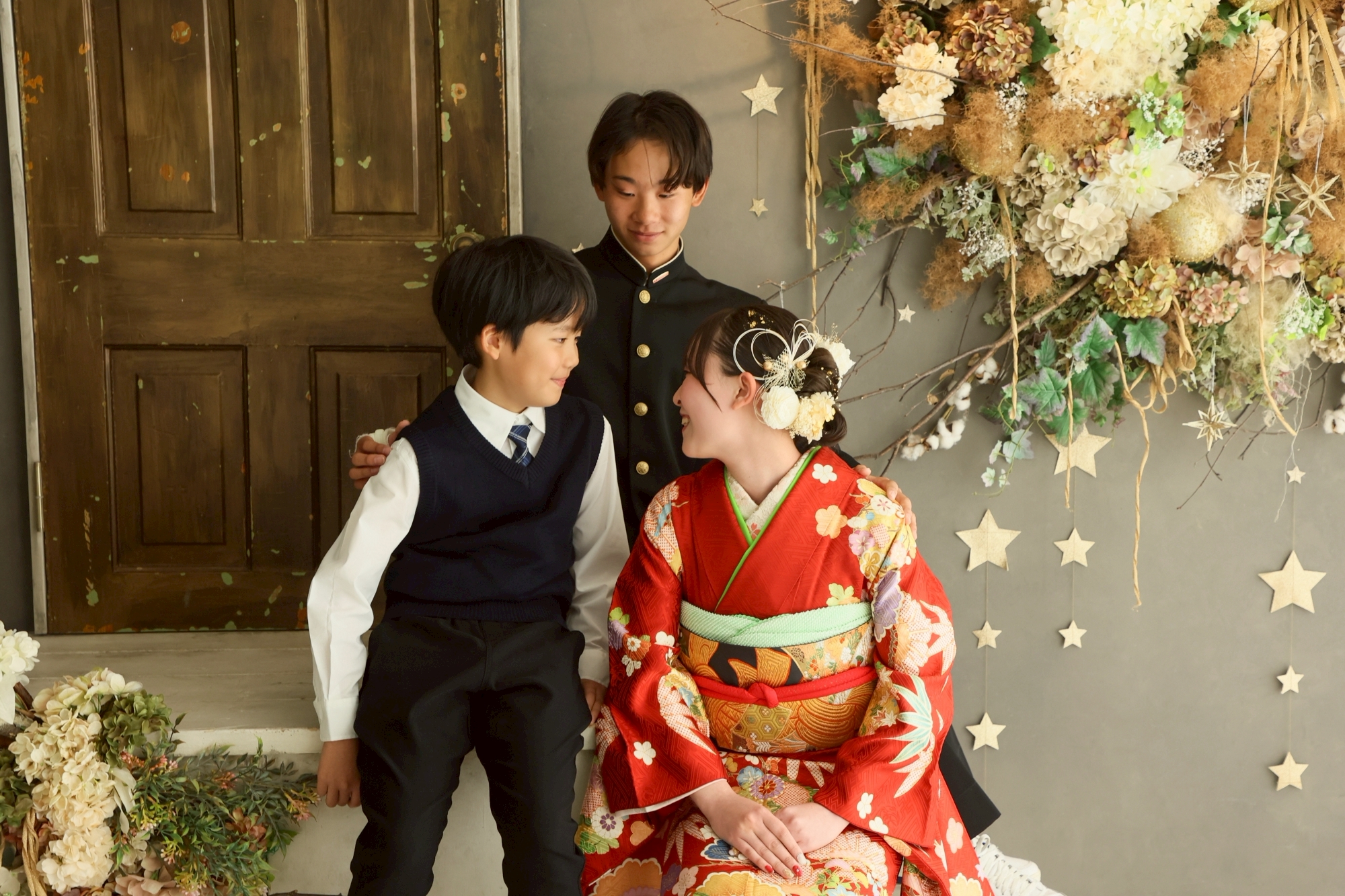 赤い振袖も華やかで可愛いです!ご兄弟で一緒に記念の撮影♡